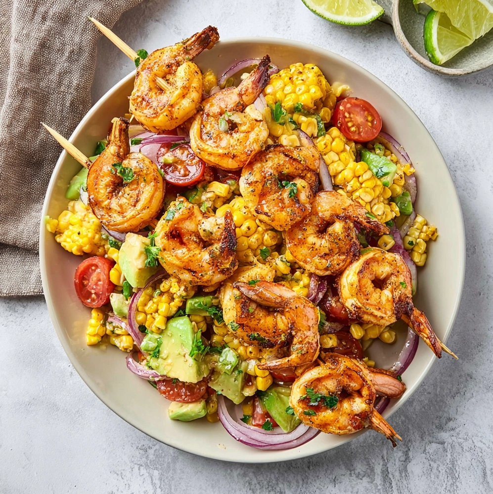 Quand je sers une Avocado Corn Salad, je la présente souvent dans un saladier large et peu profond. Ce format met en valeur les couleurs. Les grains de maïs, les tomates rouges, l’avocat vert et les herbes créent une harmonie immédiate. J’aime déposer les brochettes de crevettes par-dessus, car elles donnent de la hauteur et structurent l’ensemble. Cette présentation simple fonctionne dans toutes les situations : repas en famille, dîner entre amis ou déjeuner rapide.