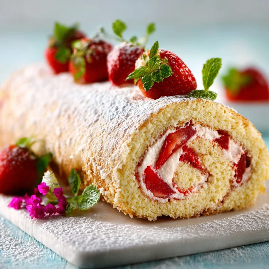 Biscuit roulé moelleux inspiré de Cyril Lignac, garni d’une chantilly mascarpone légère et de fraises et framboises fraîches.