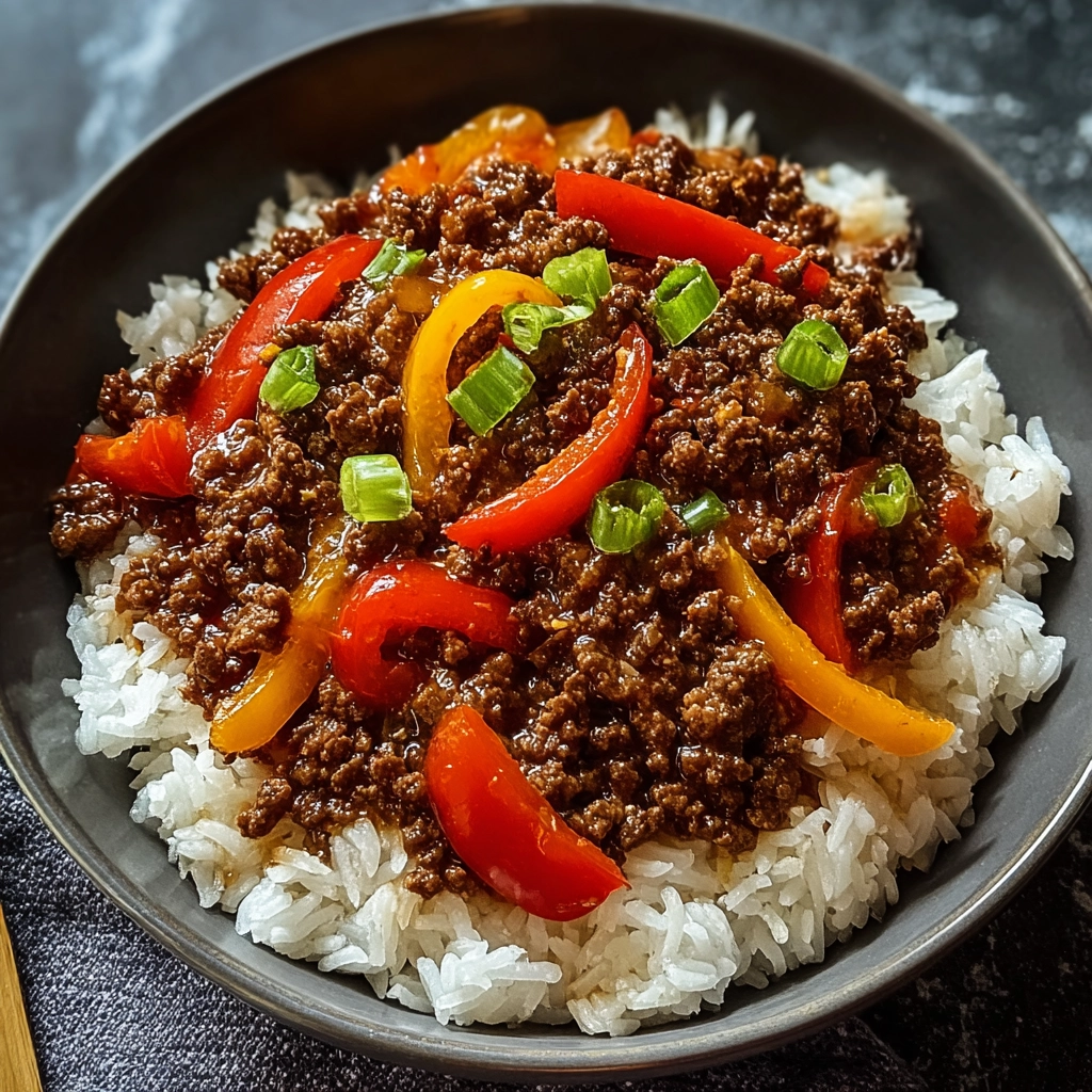 Boeuf tendre et poivrons croquants sautés dans une sauce asiatique, servis sur du riz moelleux. Rapide et simple pour un dîner tranquille.