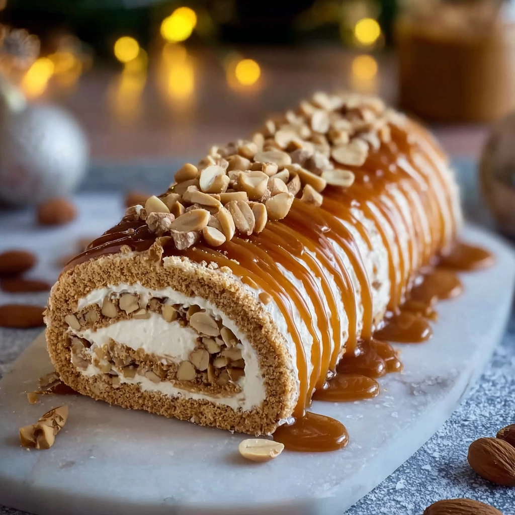 Une bûche de Noël irrésistible mariant caramel fondant, cacahuètes grillées et mousse à la vanille onctueuse.