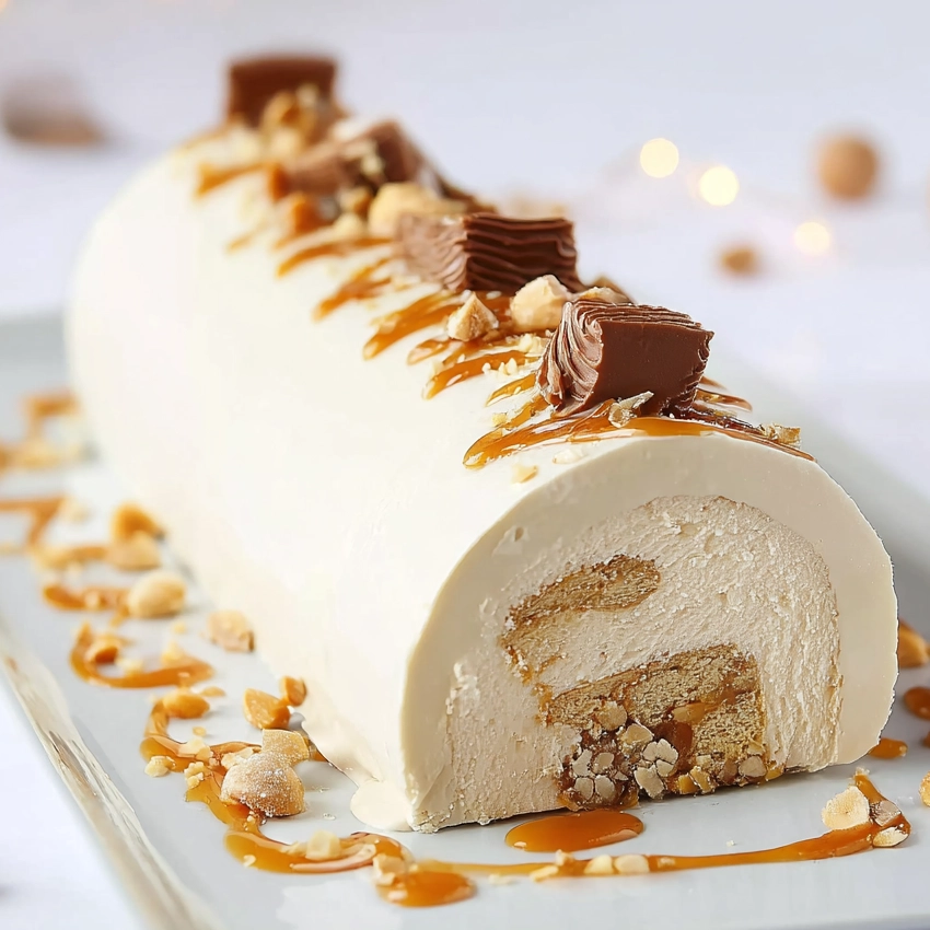 Mots clés: bûche du Nouvel An cacahuètes caramel chocolat, bûche Snickers, dessert Nouvel An