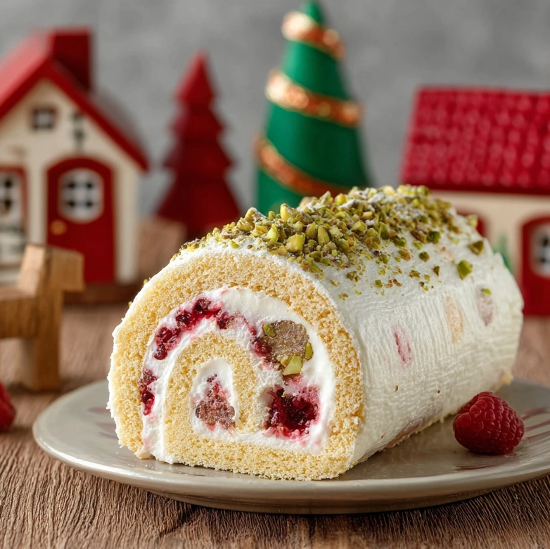 Bûche roulée framboise vanille : un dessert de Noël léger et fruité.
