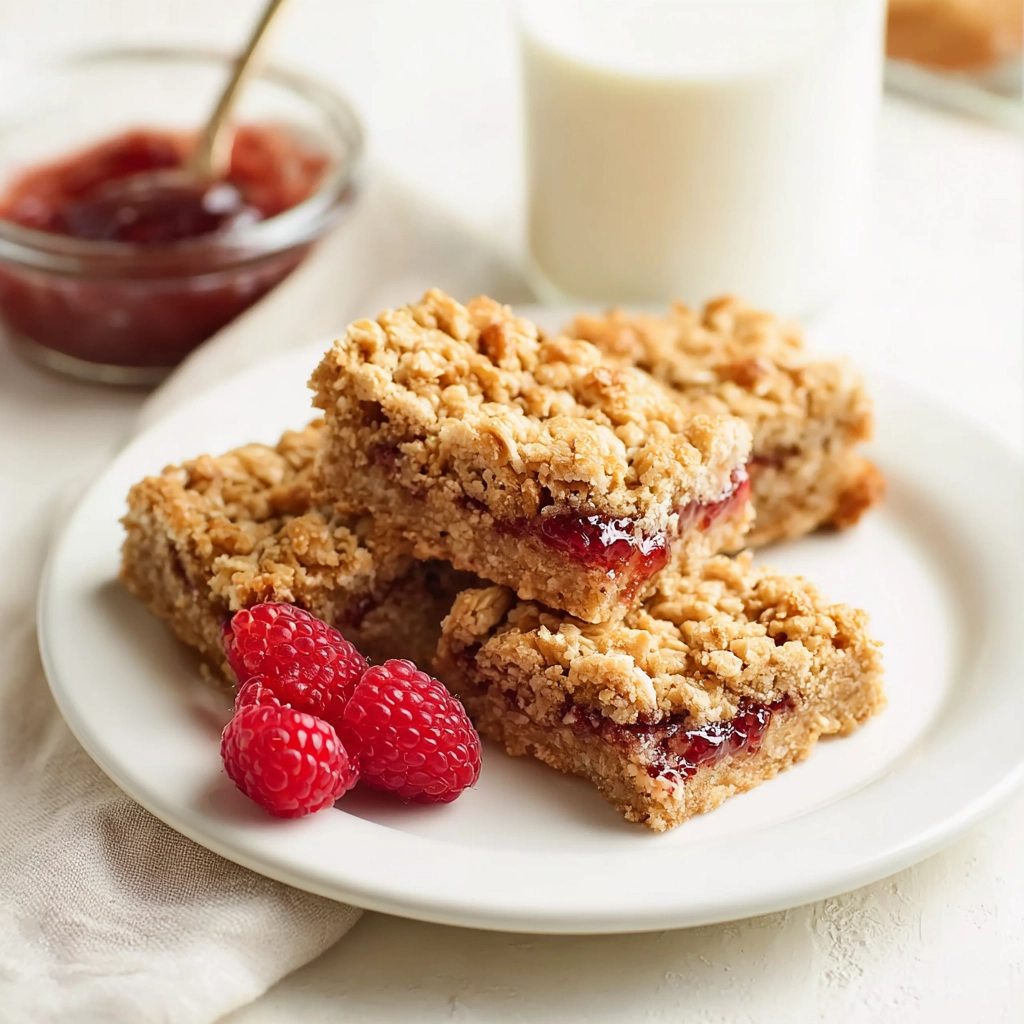 Carrés aux flocons d’avoine sans œufs, garnis de confiture de framboises, à la texture fondante et légèrement croustillante.