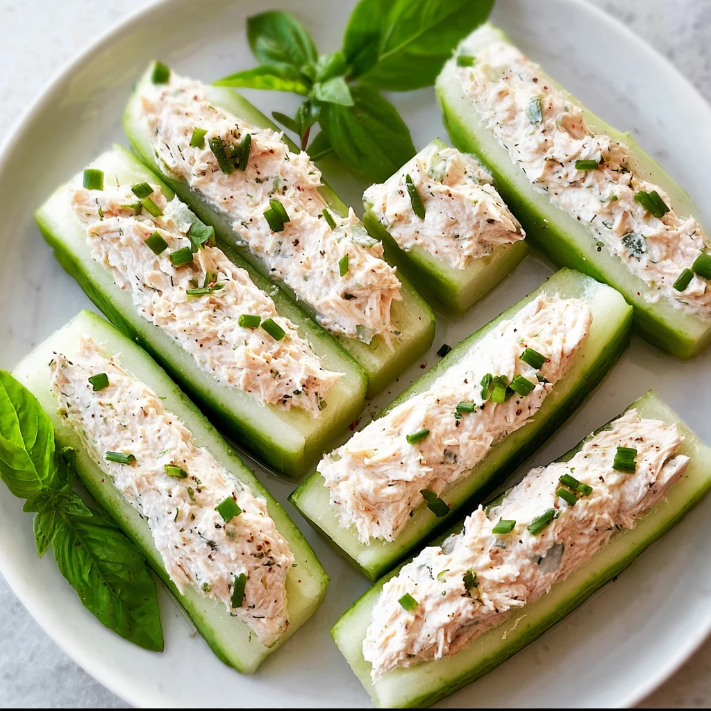 Concombres farcis au thon, une entrée froide fraîche et légère, sans cuisson, idéale en été ou pour un apéritif léger. Le concombre croquant s’associe à une farce onctueuse au thon, citronnée et parfumée aux herbes.
