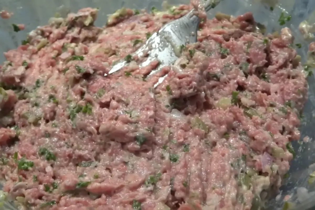 - Ajoutez les oignons, les cornichons et les câpres à la viande. Mélangez bien pour répartir uniformément les ingrédients.