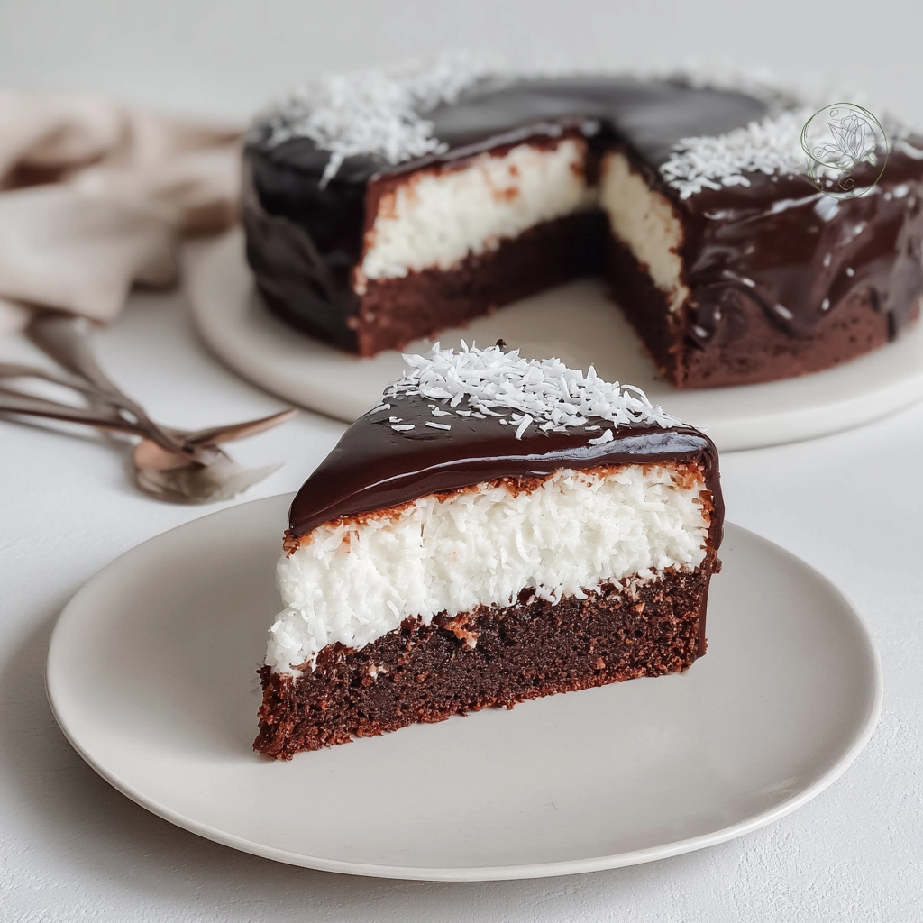 Gâteau chocolat coco fondant inspiré des saveurs Bounty, avec une texture moelleuse et un cœur délicatement parfumé.