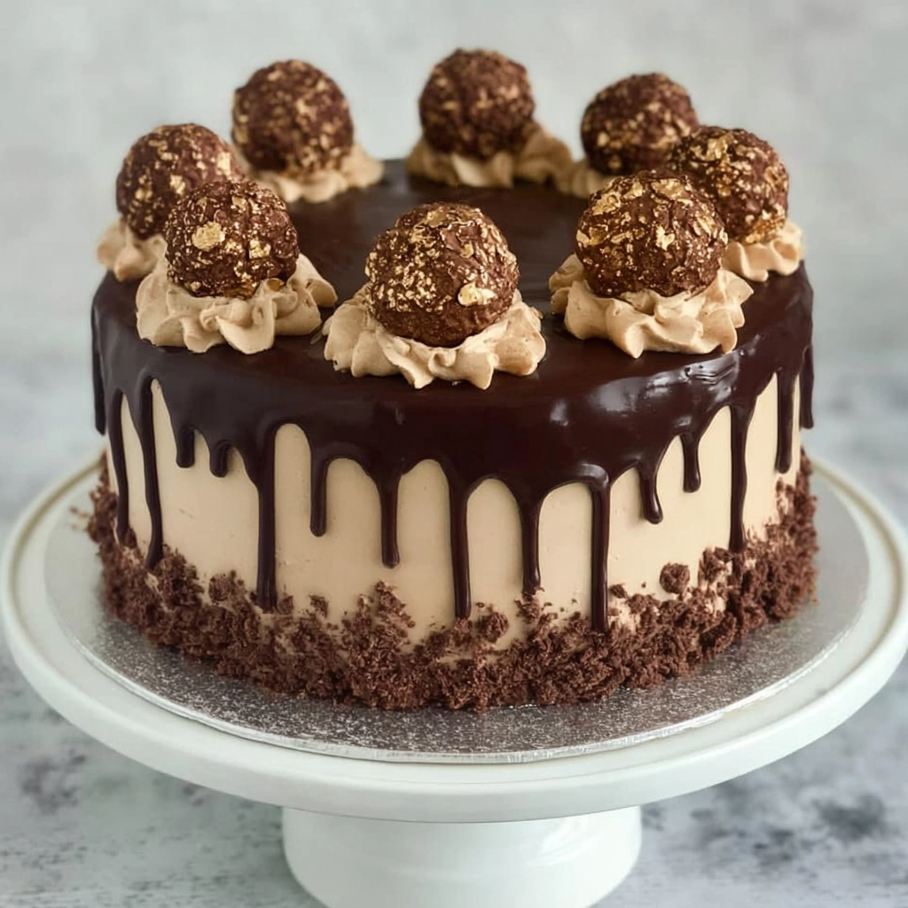 Décorez le dessus avec la crème réservée et disposez harmonieusement les Ferrero Rocher. Parsemez la base du gâteau de noisettes concassées pour une finition élégante et gourmande, idéale pour un dessert gourmand facile à présenter.