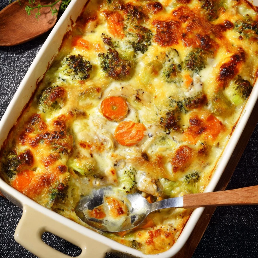 Gratin de légumes crémeux à base de brocolis, carottes et champignons, avec une sauce légère au fromage.