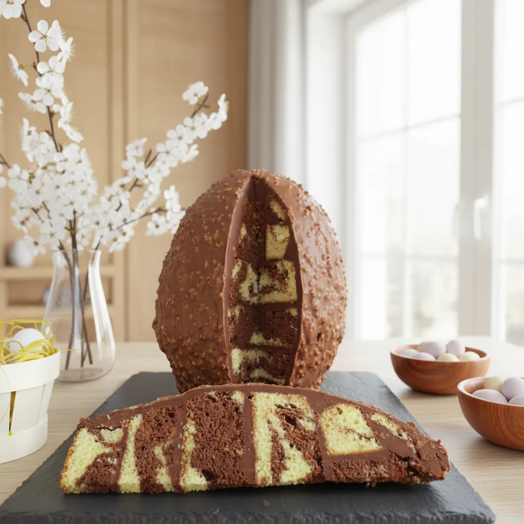 Oeuf de Pâques marbré, voici le dessert chocolaté qui impressionne dès l’arrivée sur la table. Entre le moelleux d’un marbré chocolat généreux, la douceur d’une ganache onctueuse et le croquant d’un glaçage rocher aux noisettes, ce gâteau Pâques ne laisse personne indifférent. Idéal pour partager un moment gourmand en famille, il combine textures et intensité cacaotée dans une version spectaculaire. Si vous cherchez un dessert de fête aussi beau que savoureux, cette recette devient rapidement un incontournable du printemps.