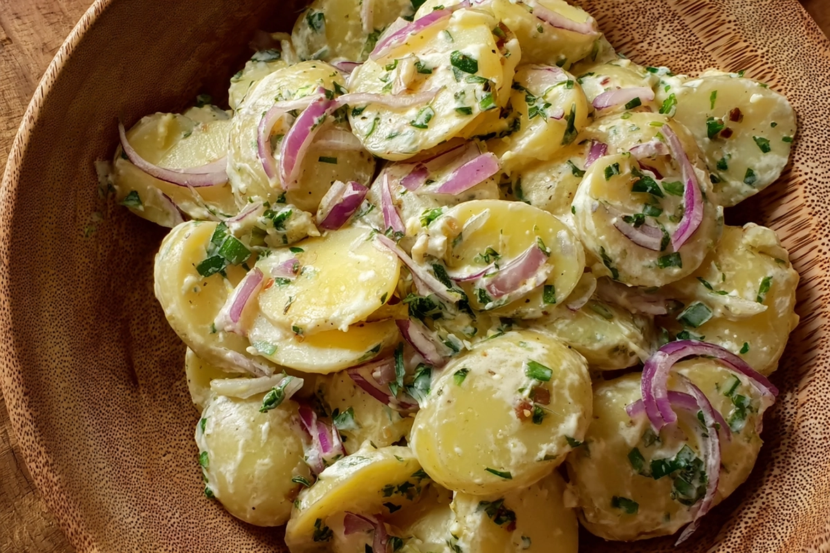 Une salade de pommes de terre tiède ou froide, inspirée des traditions alsaciennes, assaisonnée d’une vinaigrette à la moutarde douce, relevée d’oignon rouge, de vin blanc et d’herbes fraîches. Parfaite pour accompagner grillades, poissons ou plats végétariens.