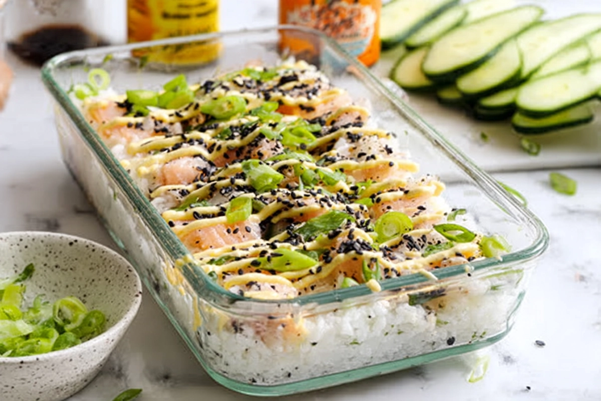 Mots clés: sushi bake, california roll, crabe, cuisine japonaise, recette au four, plat familial, comfort food